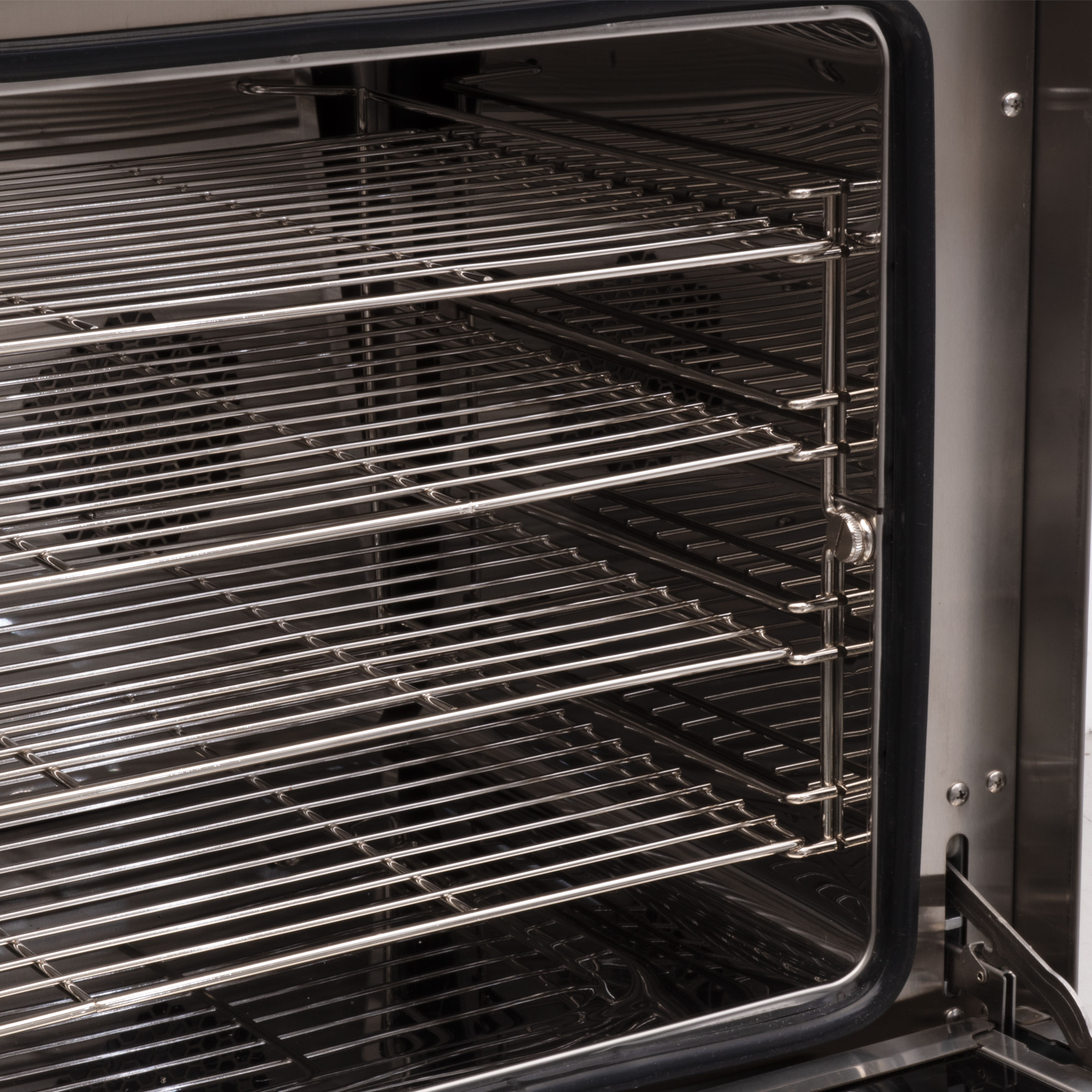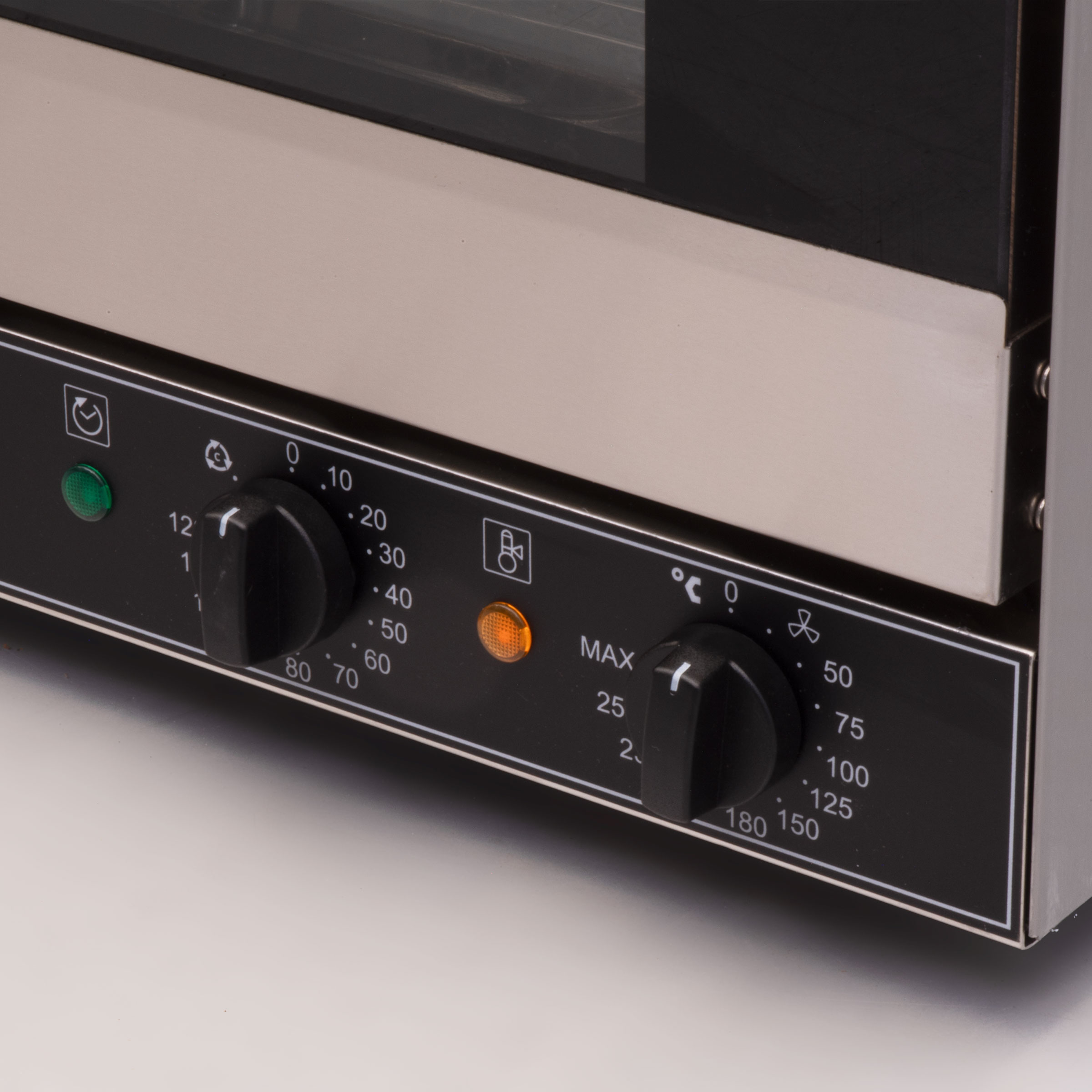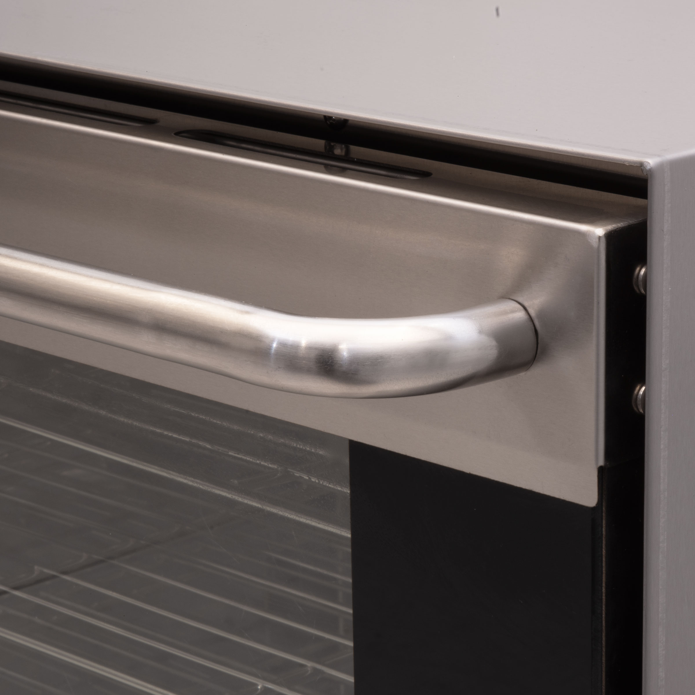 In de dagelijkse praktijk is dit zo’n oven waar je graag mee werkt: duidelijke bediening met temperatuurregeling, een timer met eindsignaal én een doorloopstand voor als je in één flow wilt blijven produceren. De stevige valdeur met brede RVS handgreep is gemaakt om vaak open en dicht te gaan, en de deurschakelaar stopt de motoren wanneer je de deur opent—wel zo veilig en prettig tijdens piekmomenten. Binnenin is de bakruimte netjes afgewerkt met ronde hoeken en verlichting, waardoor je snel kunt checken zonder onnodig lang de deur open te houden.