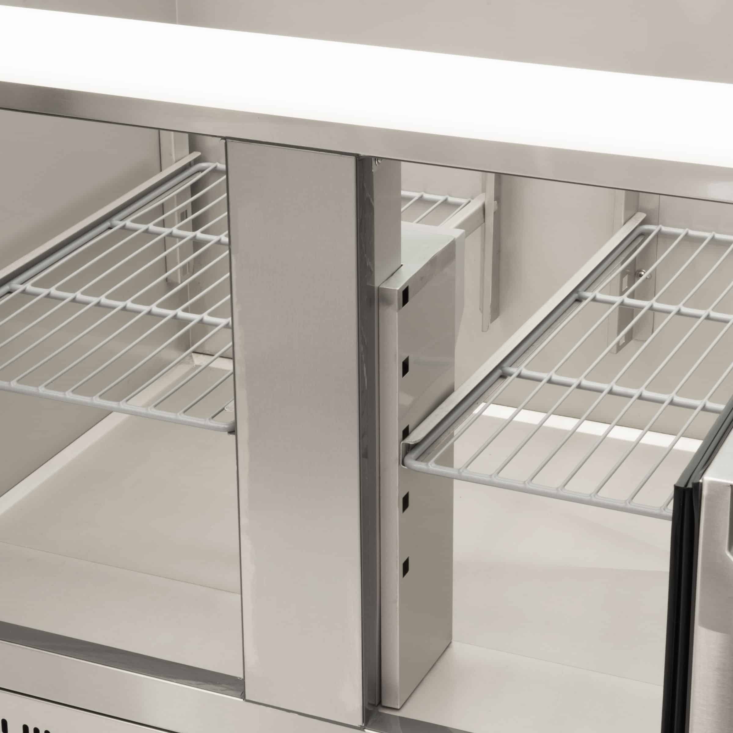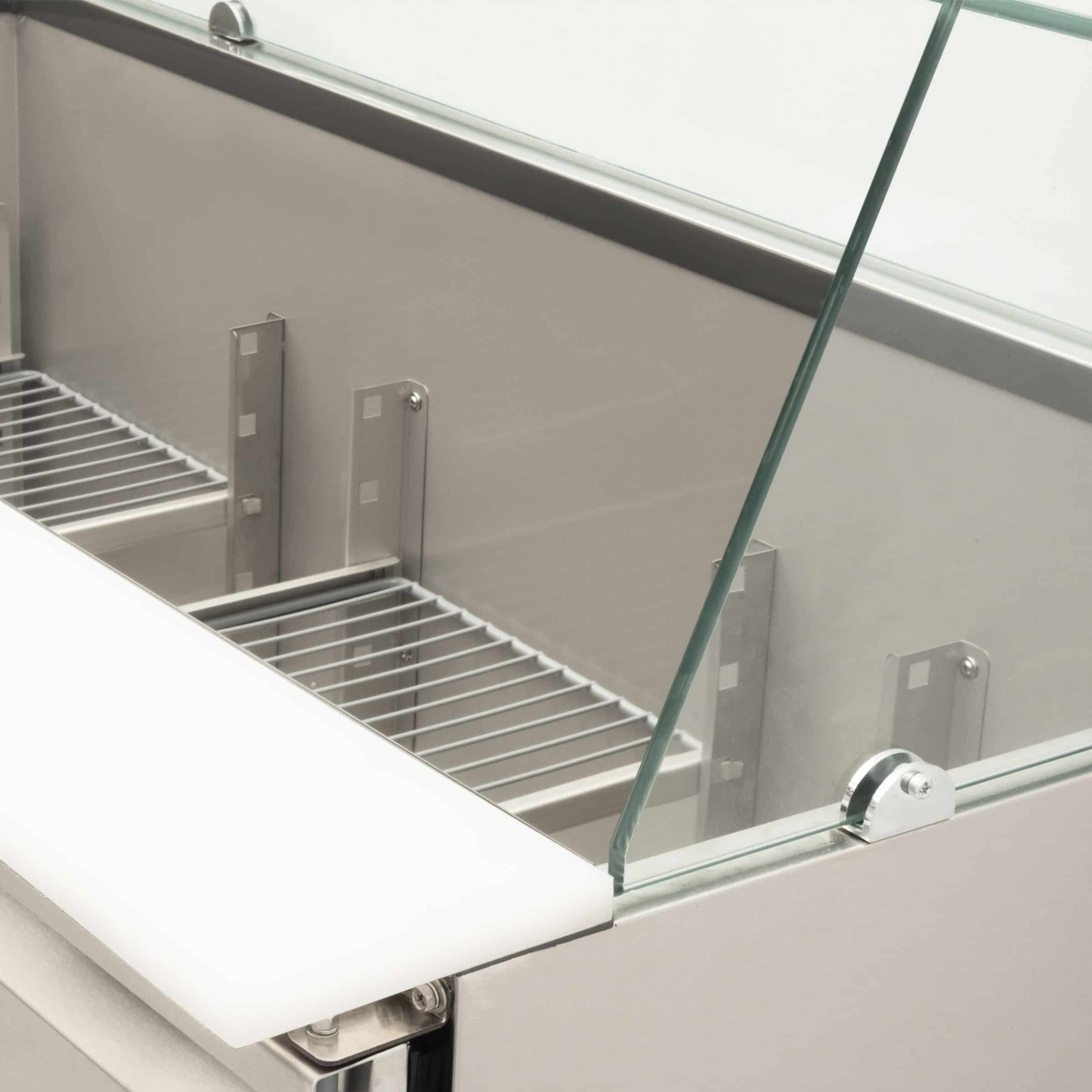 Mit Platz für 1/1-Gastronorm-Behälter bietet diese gekühlte Werkbank genügend Stauraum für alle Ihre Zutaten, Saucen und Dressings.