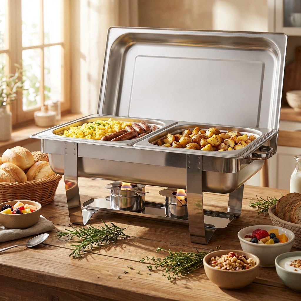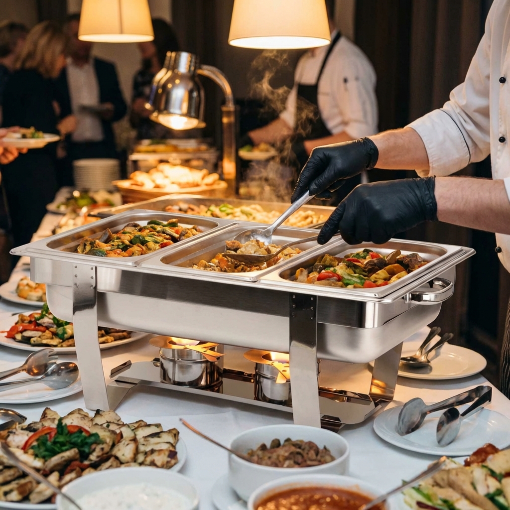 Die perfekte Art, Ihre Gerichte heiß und schön zu präsentieren, ist mit einem Chafing Dish. Die Gerichte bleiben perfekt auf Temperatur und werden geschmackvoll präsentiert.