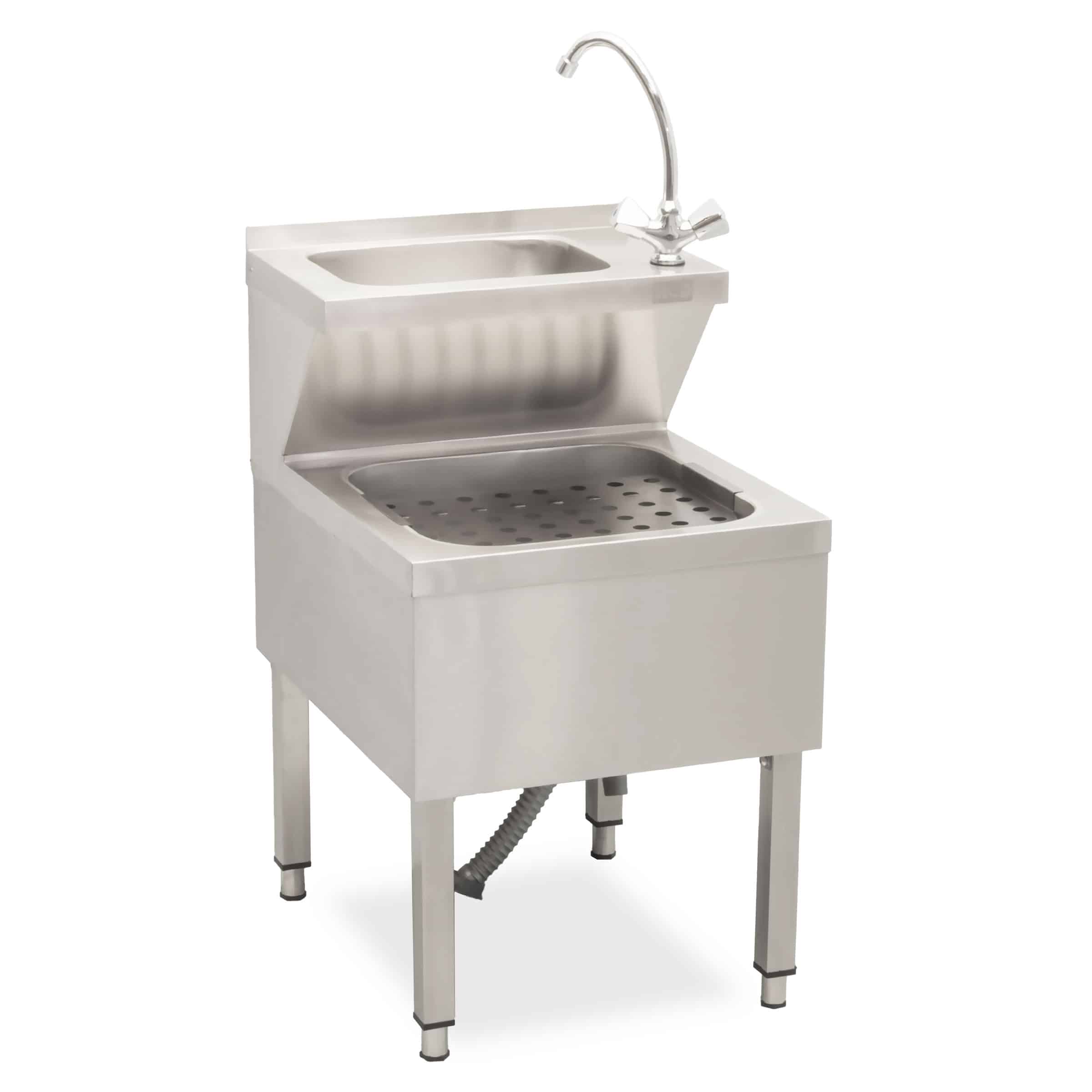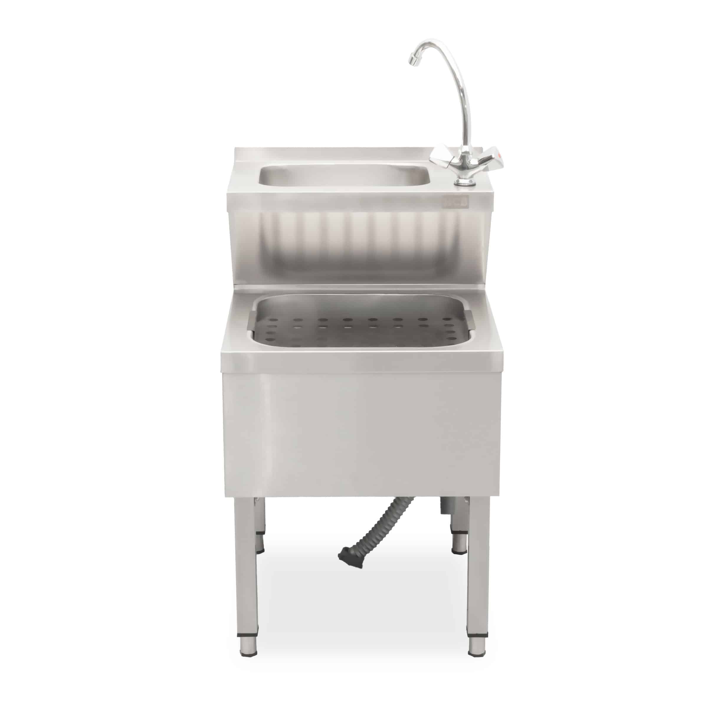 Diese praktische und langlebige Doppelspüle ist ideal für den Einsatz in Großküchen und anderen Umgebungen, in denen Hygiene und Effizienz an erster Stelle stehen. Die Spüle ist mit einem Ausgussbecken ausgestattet.