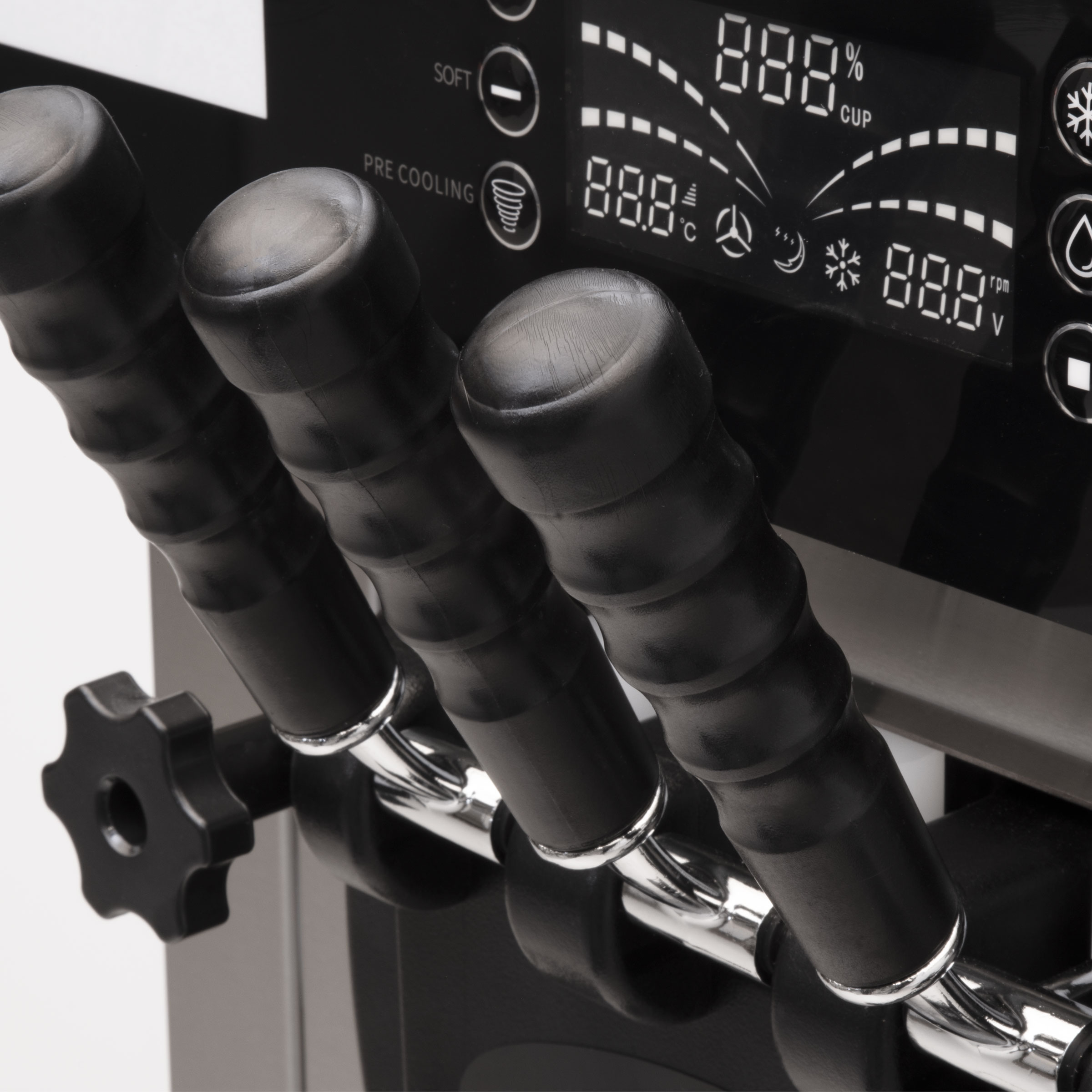 Die Softeismaschine ist mit einem leistungsstarken Kompressor ausgestattet, der schnell für die perfekte Konsistenz der Eiscreme sorgt. Die Maschine verfügt außerdem über ein integriertes Kühlsystem, das das Eis auf der richtigen Temperatur hält und für eine Konsistenz sorgt, die problemlos aus der Maschine serviert werden kann.