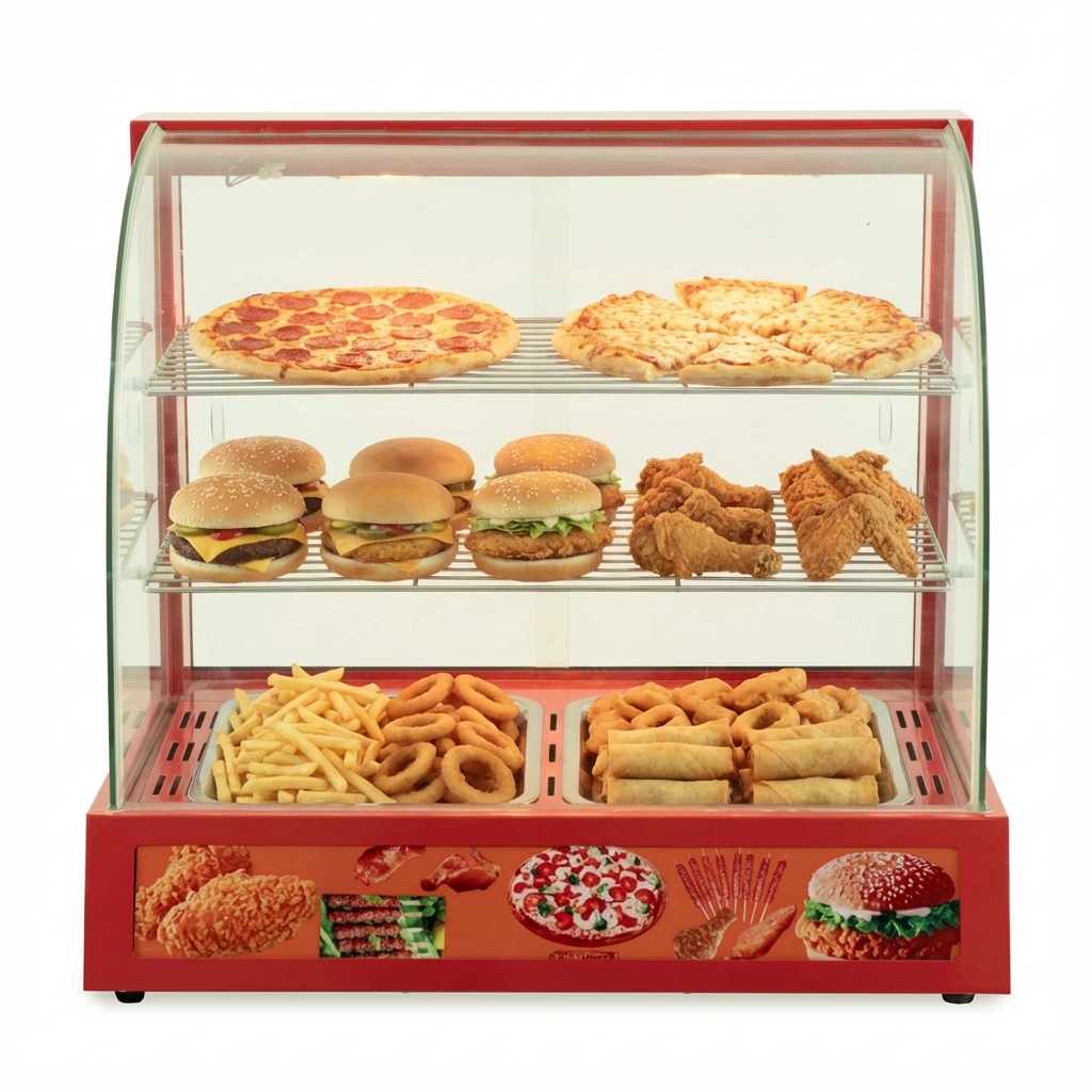 Unsere Warmhaltevitrine besteht aus hochwertigen Materialien und wurde sorgfältig entworfen, um die beste Temperatur zu halten. Die Vitrine ist mit einem leistungsstarken Heizsystem ausgestattet, das für eine gleichmäßige Wärmeverteilung sorgt und die Lebensmittel auf der richtigen Temperatur hält, ohne dass sie austrocknen oder überhitzen.