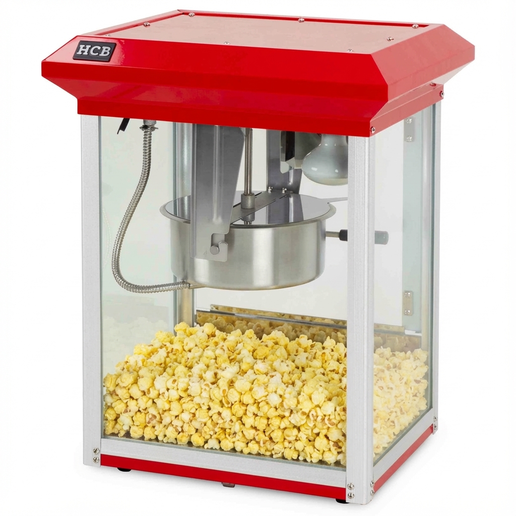 Professionelle Popcornmaschine, energieeffizient und sicher in der Anwendung. Rahmen aus Aluminiumlegierung, robustes Gehäuse aus gehärtetem Glas und rot pulverbeschichtetem Stahl. Die Popcornpfanne ist mit einem Rührwerk ausgestattet und lässt sich dank eines Bügels leicht entleeren. Die Bedienseite hat eine praktische Klappe zum Schöpfen von Popcorn sowie eine große Drehtür aus Acrylglas. Die Kammer ist beleuchtet, um das frisch gepoppte Popcorn schön zu präsentieren. Das praktische Krümelfach unter dem Schrank erleichtert das Entfernen von nicht gepoppten Körnern und Krümeln. Die Zubereitung einer Ladung Popcorn dauert etwa 2 Minuten.