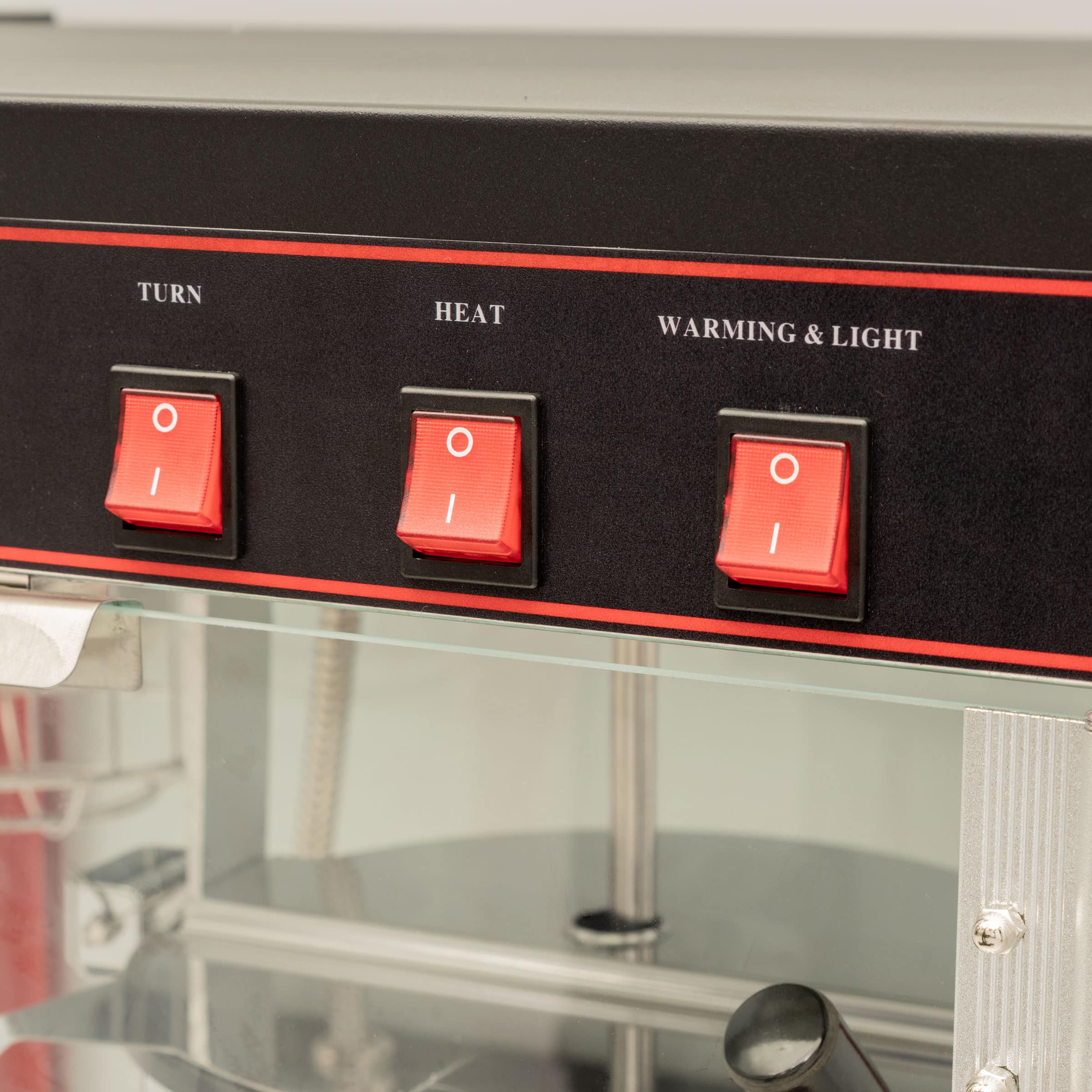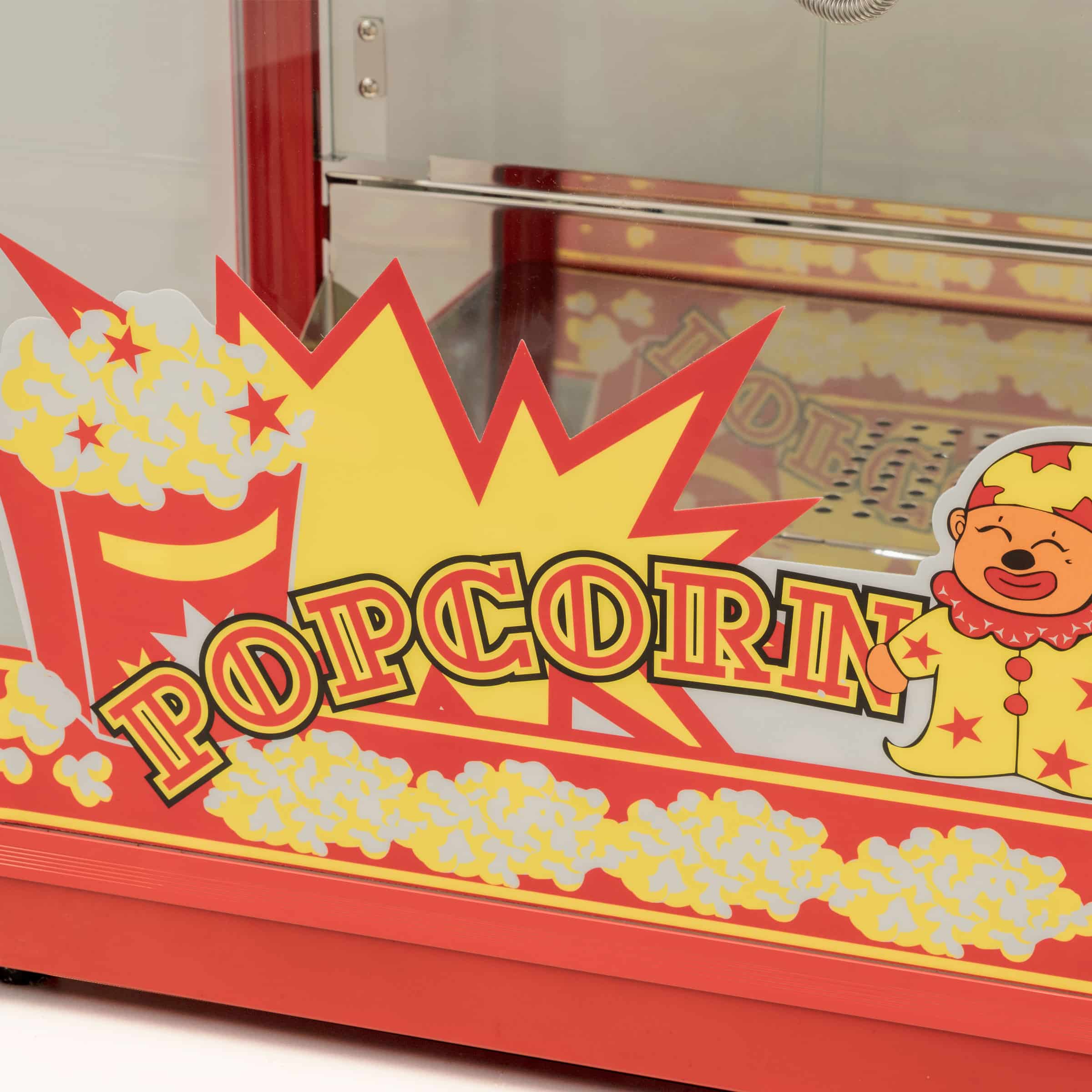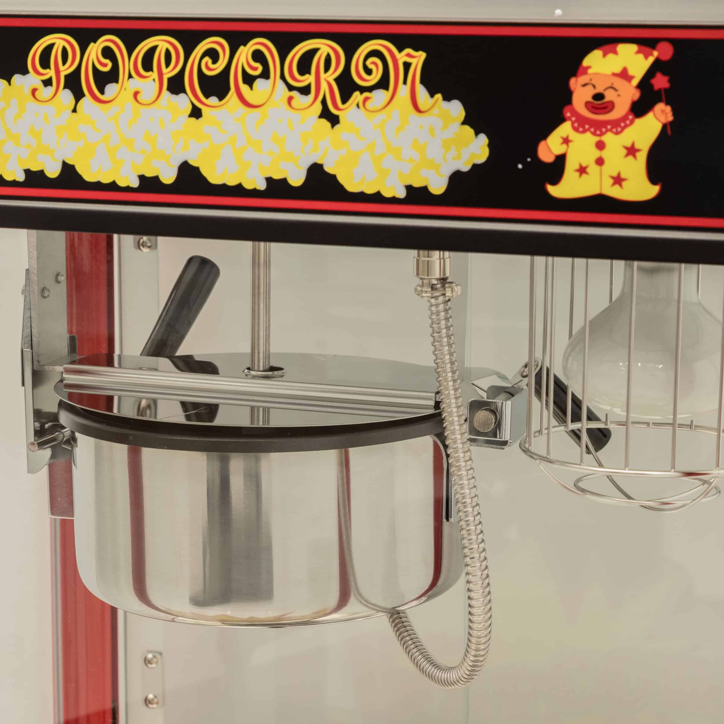 Professionelle Popcornmaschine, energieeffizient und sicher in der Anwendung. Rahmen aus Aluminiumlegierung, robustes Gehäuse aus gehärtetem Glas und rot pulverbeschichtetem Stahl. Die Popcornpfanne ist mit einem Rührwerk ausgestattet und lässt sich dank eines Bügels leicht entleeren. Die Bedienseite hat eine praktische Klappe zum Schöpfen von Popcorn sowie eine große Drehtür aus Acrylglas. Die Kammer ist beleuchtet, um das frisch gepoppte Popcorn schön zu präsentieren. Das praktische Krümelfach unter dem Schrank erleichtert das Entfernen von nicht gepoppten Körnern und Krümeln. Die Zubereitung einer Ladung Popcorn dauert etwa 2 Minuten.