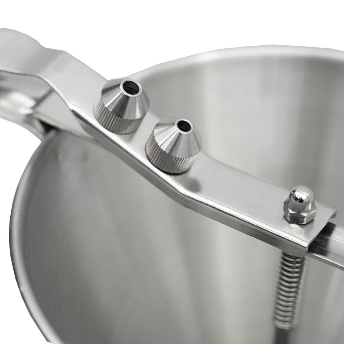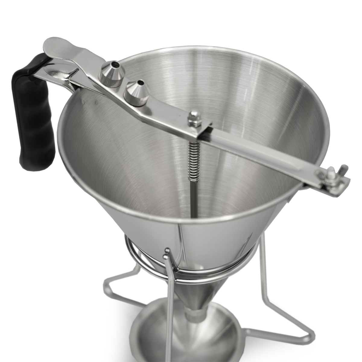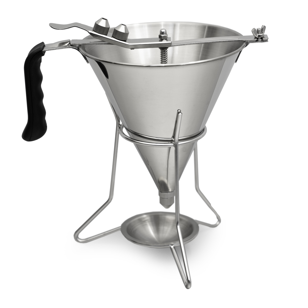 De dispenser is gemaakt van roestvrij staal en ligt prettig in de hand. Dankzij de handige hendel doseer je gecontroleerd: je bepaalt zelf wanneer het beslag stroomt en wanneer je ‘m direct weer afsluit. Dat geeft rust in de workflow én voorkomt geknoei op je werkbank, bakplaat of wafelijzer.