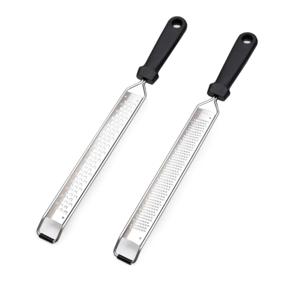 Beide Reiben haben einen silbernen Edelstahlrahmen und einen stabilen schwarzen Kunststoffgriff. Das sorgt für Langlebigkeit, Stabilität und einen bequemen, ergonomischen Griff, auch bei intensivem Gebrauch in der Küche. Nach dem Gebrauch können die Reiben einfach in der Spülmaschine gereinigt werden, was Zeit spart.