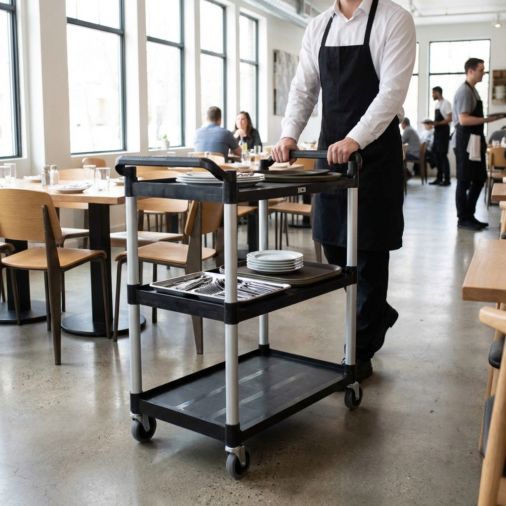 Der Servierwagen ist aus hochwertigem Kunststoff gefertigt, der langlebig und leicht zu reinigen ist. Das Material ist resistent gegen Flecken, Dellen und Kratzer, so dass der Wagen auch nach intensivem Gebrauch noch professionell aussieht. Außerdem ist der Kunststoff leicht, so dass der Wagen auch bei voller Beladung leicht zu manövrieren ist.